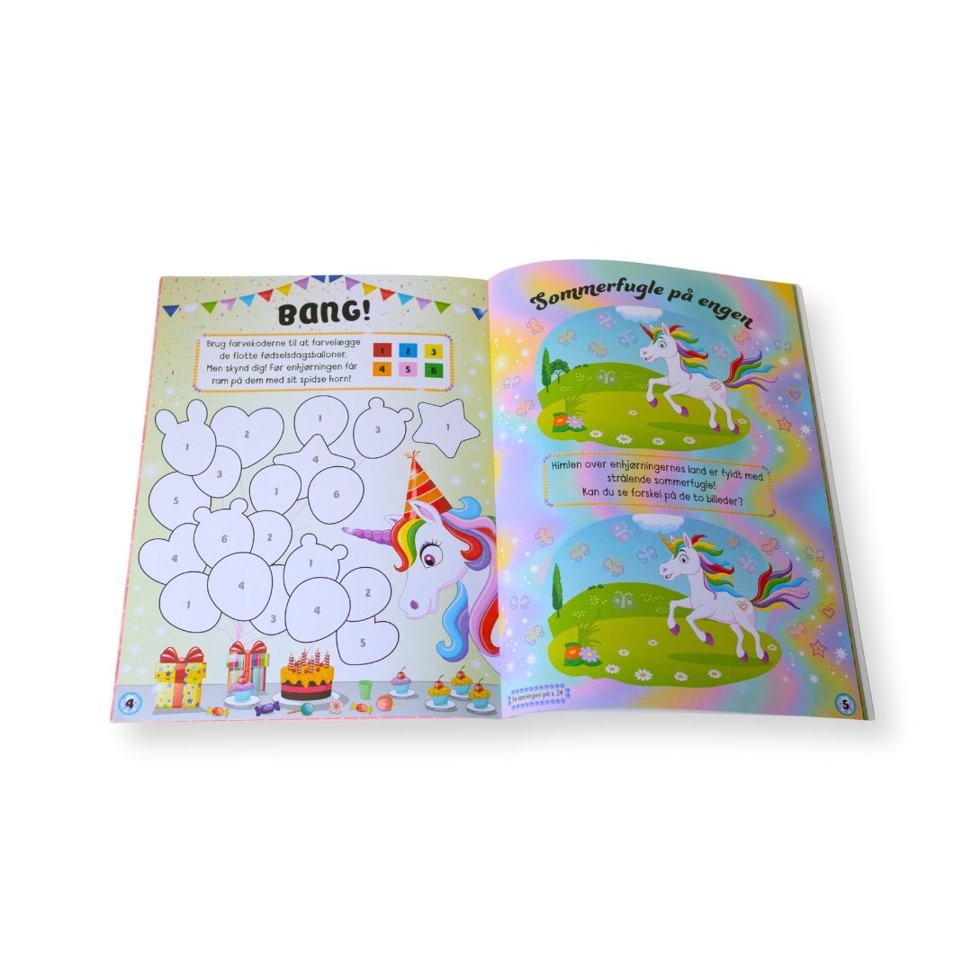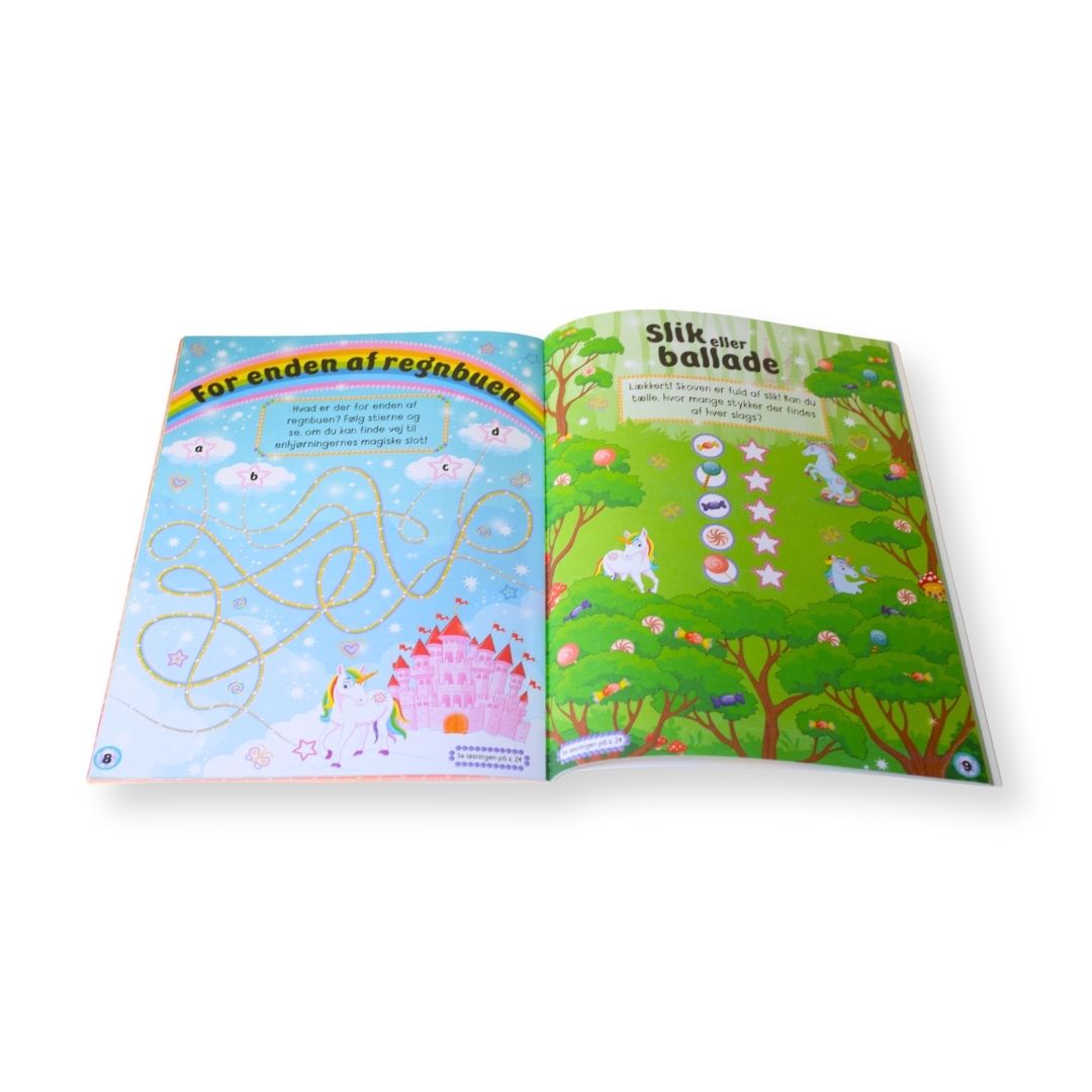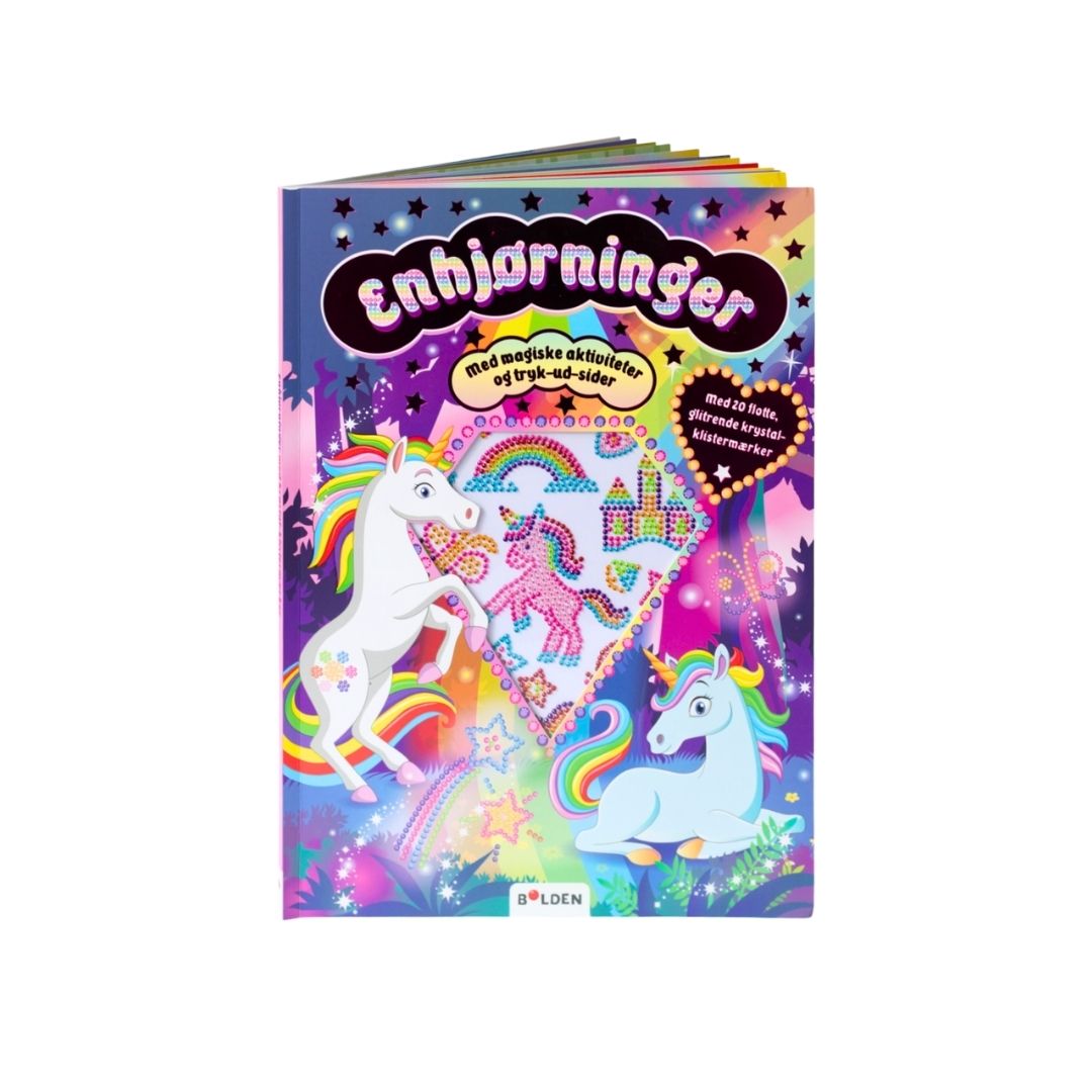 Bogen indeholder 24 siders enhjørningesjov: drømmeagtige tegnesider, magiske labyrinter og sjove prik-til-prik-opgaver. Derudover indeholder den 6 sjove tryk-ud-sider og et ark med 20 flotte, skinnende krystal-klistermærker, som du kan sætte hvor end, du har lyst!