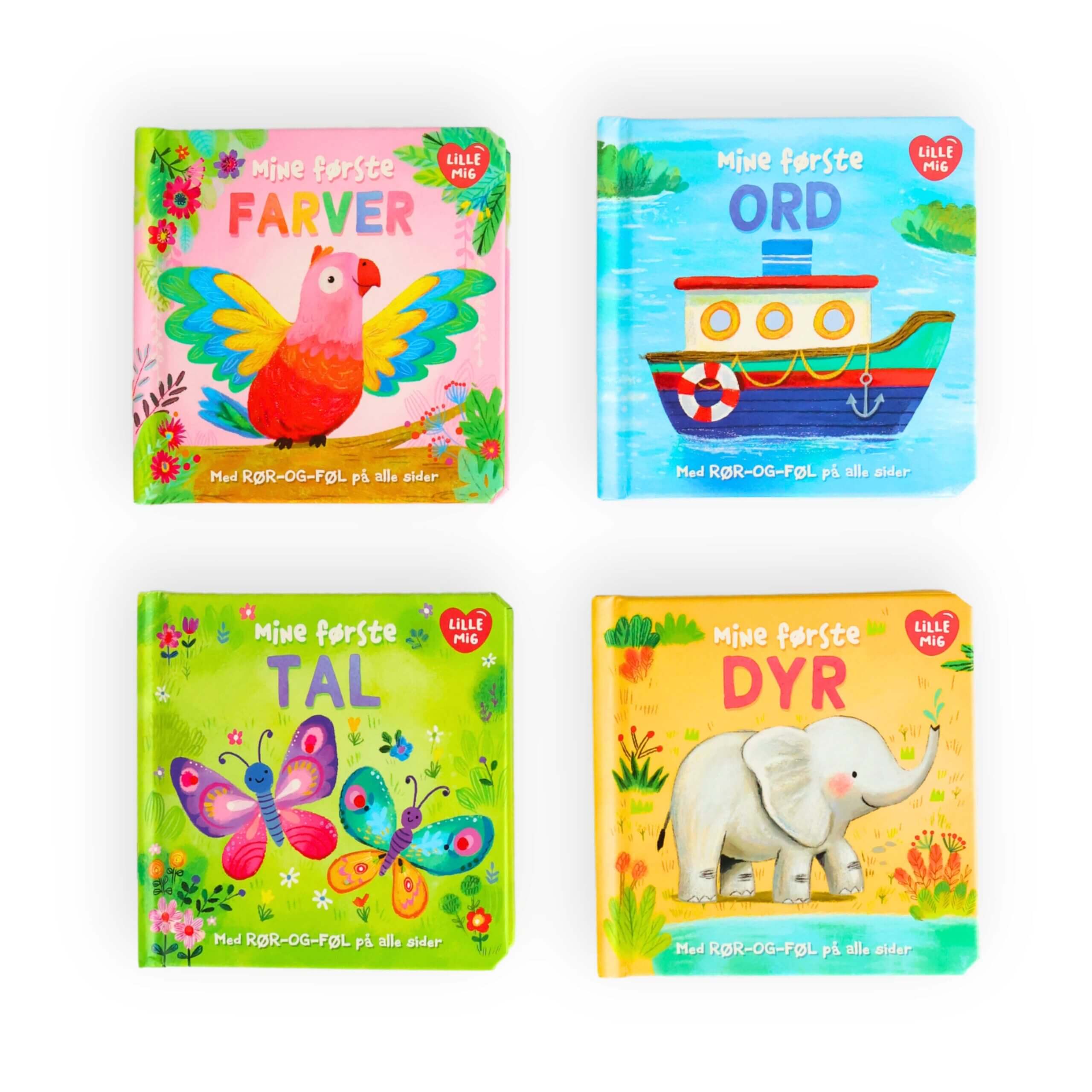 “Søde og traditionelle pegebøger til at lære de første ord og til sprogstimulering. Føleeffekterne har forskellige teksturer og glimmereffekter, hvilket stimulerer den taktile sans.”