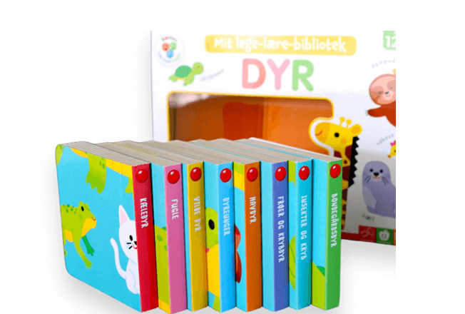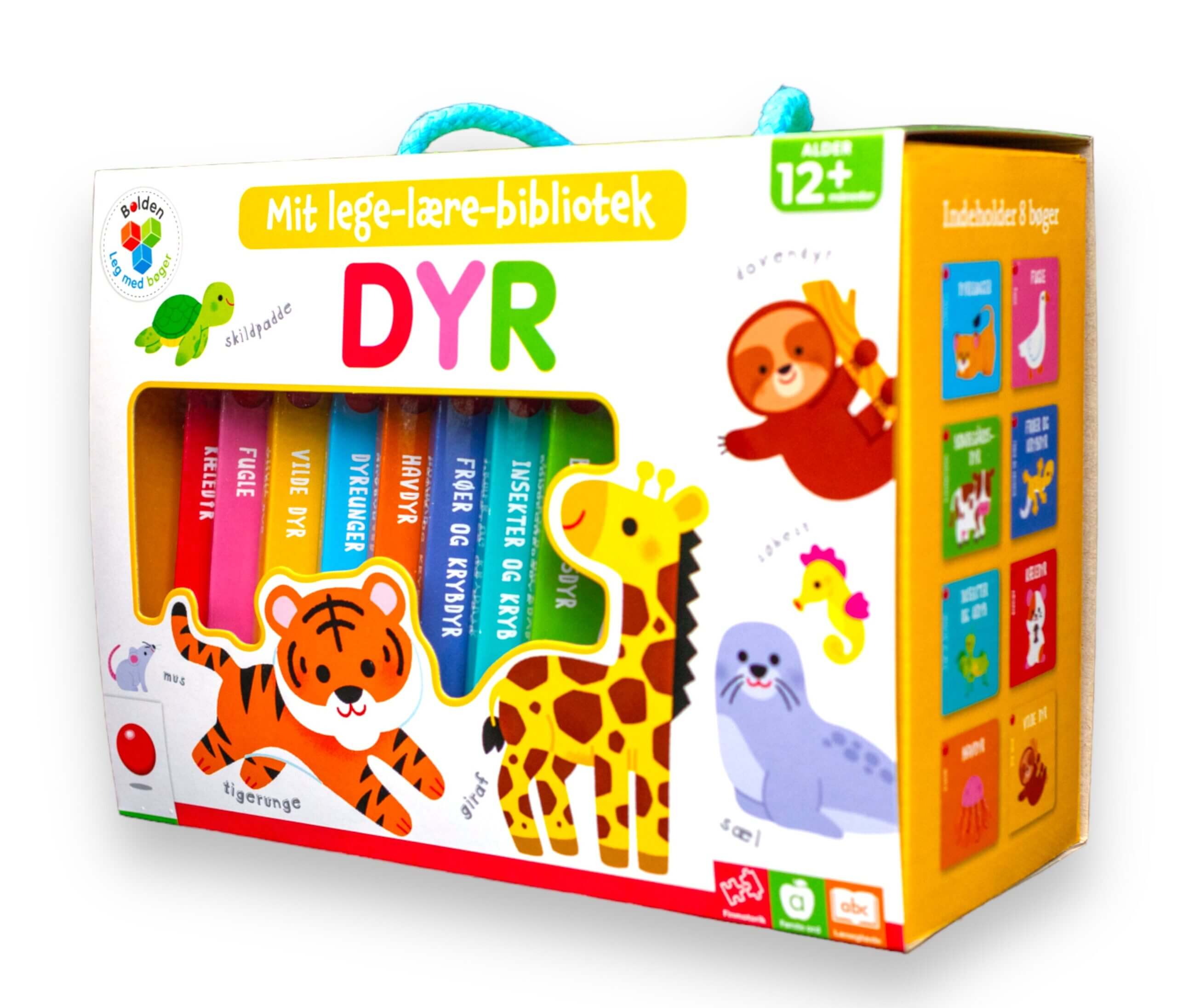 Mit lege-lære-bibliotek: Dyr indeholder otte små kraftige papbøger med søde, farverige illustrationer af mange forskellige dyr. Barnet vil elske at kigge, pege og navngive alle de kendte og mindre dyr, mens både observations-evne, læseglæde og ordforråd udvikles.