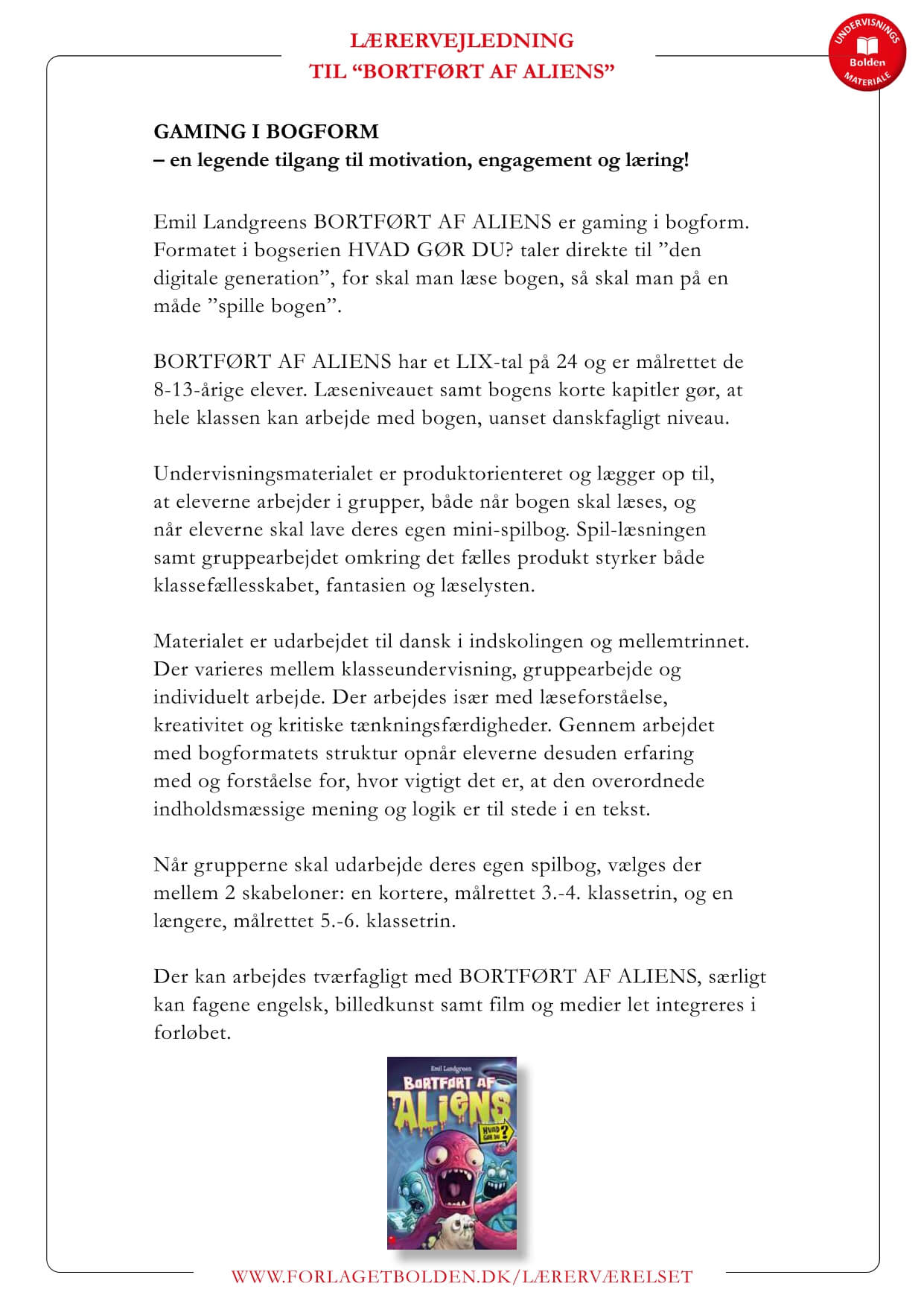 BORTFØRT AF ALIENS er en del af bogserien HVAD GØR DU? – hvor læseren bestemmer handlingen! Hver historie indeholder mange forskellige veje og slutninger. Bøgerne i serien er målrettet de 8-13-årige elever og har et LIX-tal på 24. Læseniveauet samt bogens korte kapitler gør, at hele klassen kan arbejde med bogen.